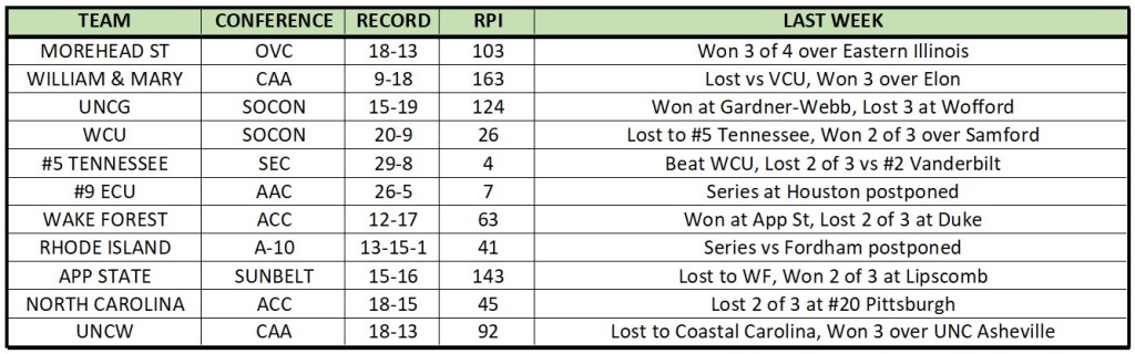 Rankings, Rankings, & More Rankings – After a 3-1 week the Niners continued to receive national recognition in the polls. This week the Niners jumped up 2 spots to #19 in D1 Baseball’s Top 25. They are also ranked 29th by Collegiate Baseball Newspaper, 21st in the USA Today Coaches Poll, and 24th in the NCBWA poll. The Niners have also been projected to earn a post season regional berth by both Baseball America and D1 Baseball.