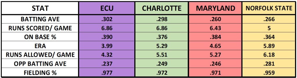 Now, lets take a look at the teams participating in the Greenville Regional. East Carolina is the host and #1 Seed, Charlotte is #2, Maryland is the #3, and Norfolk State is the 4 seed. First we can get a “bird’s eye view” of the four teams by taking a broad look at a few season long stats. Keep in mind that the 49ers played 58 games, ECU played 56 games, Norfolk State played 51 games, and Maryland played only 44 games.