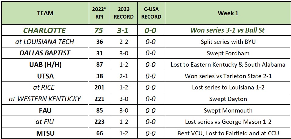 We are back tracking the Niners and their opponents this season. It is a little too early to look at the RPI this season, so we’ve included the final RPI from last season. Conference USA went 20-12 in Week 1. Charlotte will travel to Clemson on Tuesday and return home to face Army this weekend.