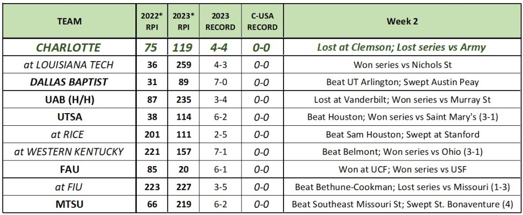 We are now two weeks in to the 2023 season, and halfway through the Non-Conference weekend schedule. The Niners sit at 4-4, with three losses by only 1-run. This week Charlotte will host UNC Asheville and then travel to #11 Virginia Tech for their first road series of the season.
