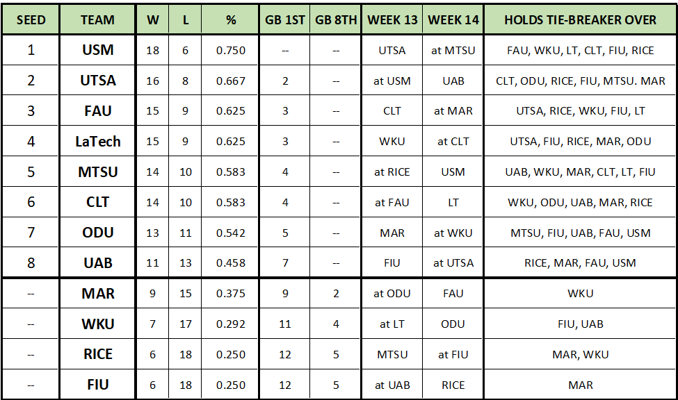 There are 2 weeks remaining in the season and only USM & UTSA have clinched spots in the tournament. The Top 8 teams qualify for the C-USA tournament and no one has been eliminated yet. There are still 7 teams in the running to win the regular season title. Below is a chart showing the current standings, the remaining schedules, and tie breakers.