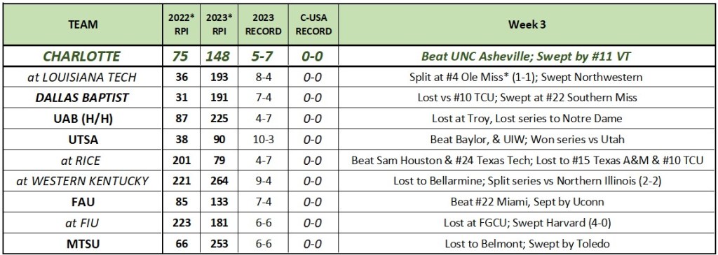 We are back tracking the Niners and their opponents this season. It is a little too early to look at the RPI this season, so we’ve included the final RPI from last season. Conference USA went 20-12 in Week 1. Charlotte will travel to Clemson on Tuesday and return home to face Army this weekend.